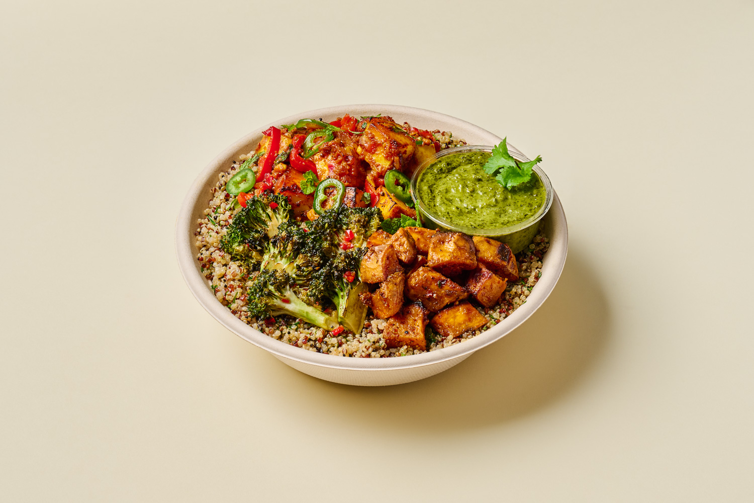 Mixed Quinoa, Tandoori Chicken or Chilli Paneer (V, DF), Masala Spiced Sweet Potato, Charred Cumin + Miso Broccoli, Coriander Chutney